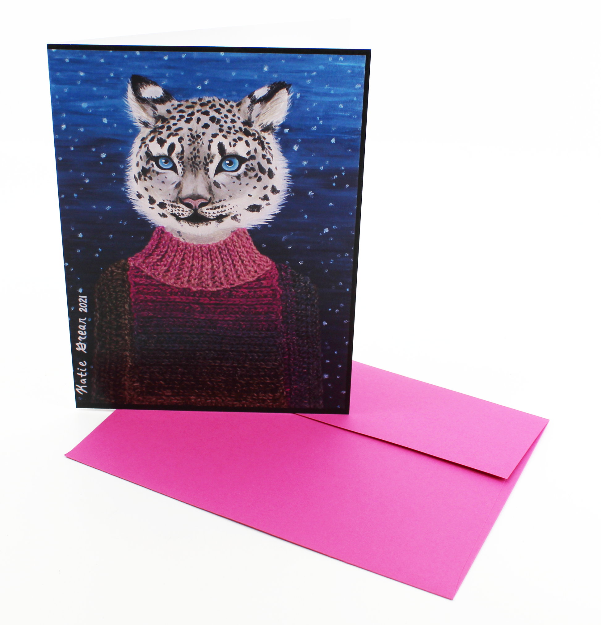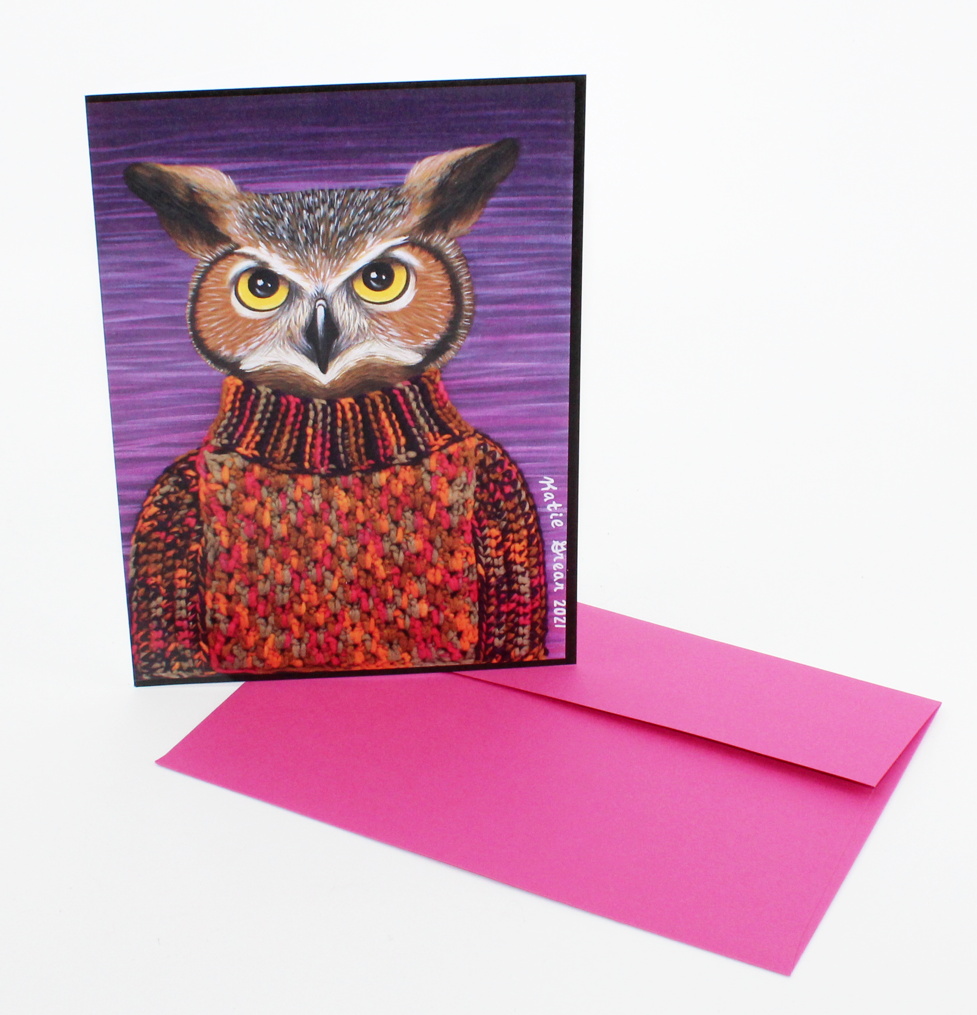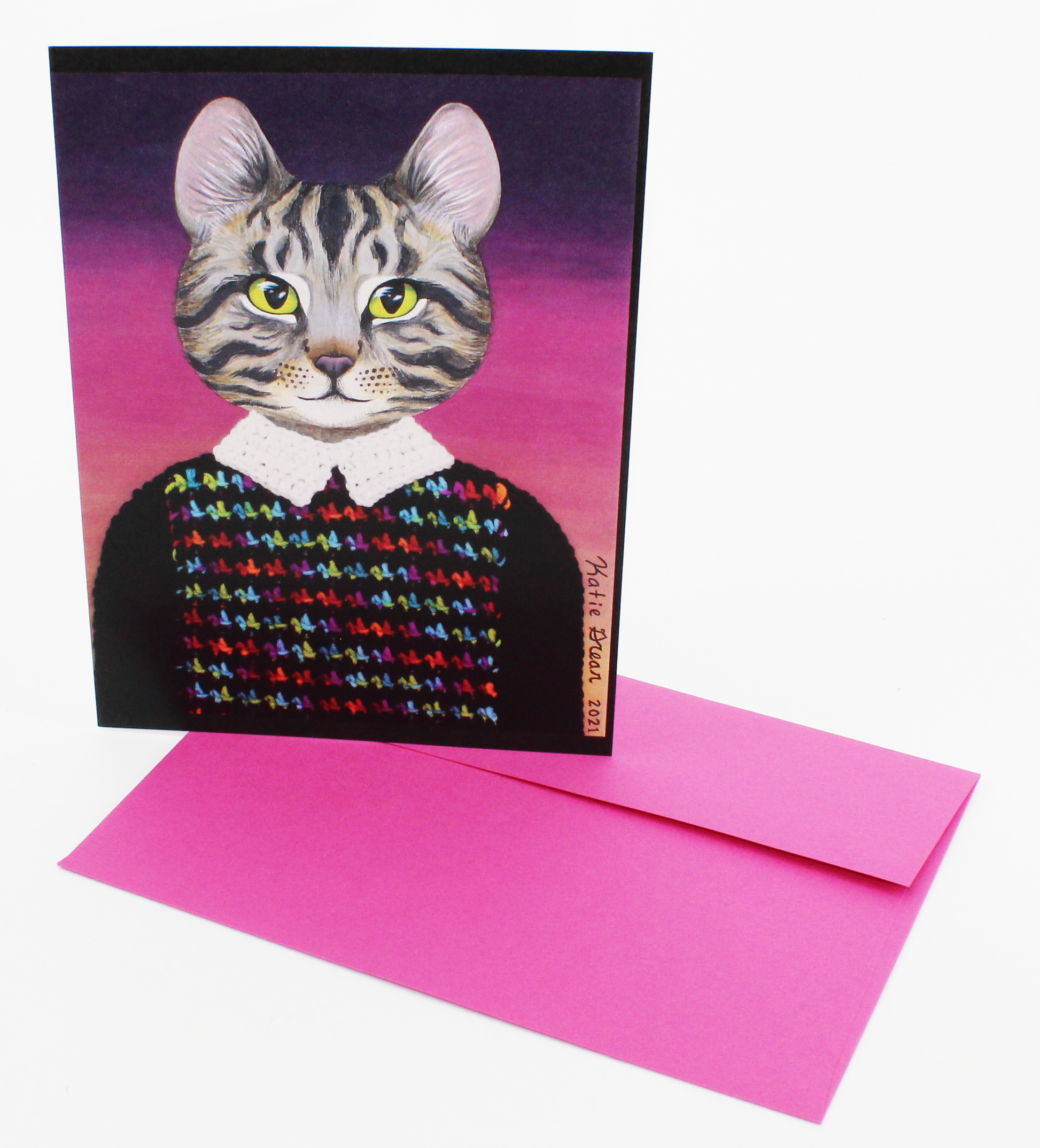 Van Go Grad Katie Grear has put her incredible talent to work with six stunning painted animal portraits. She then knit colorful patterned sweaters for each critter and gave it a name to match its personality. These mixed media masterpieces have been photographed and transformed into this set of charming cards for your enjoyment.
