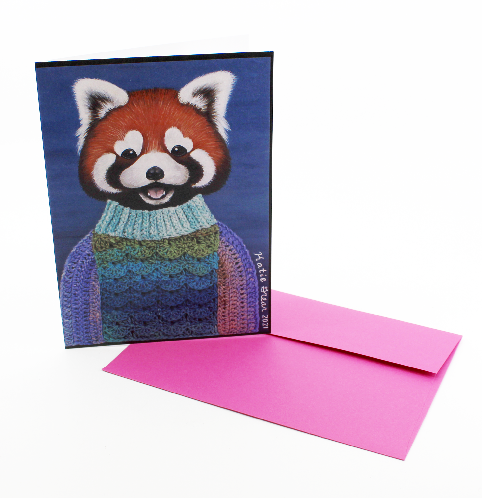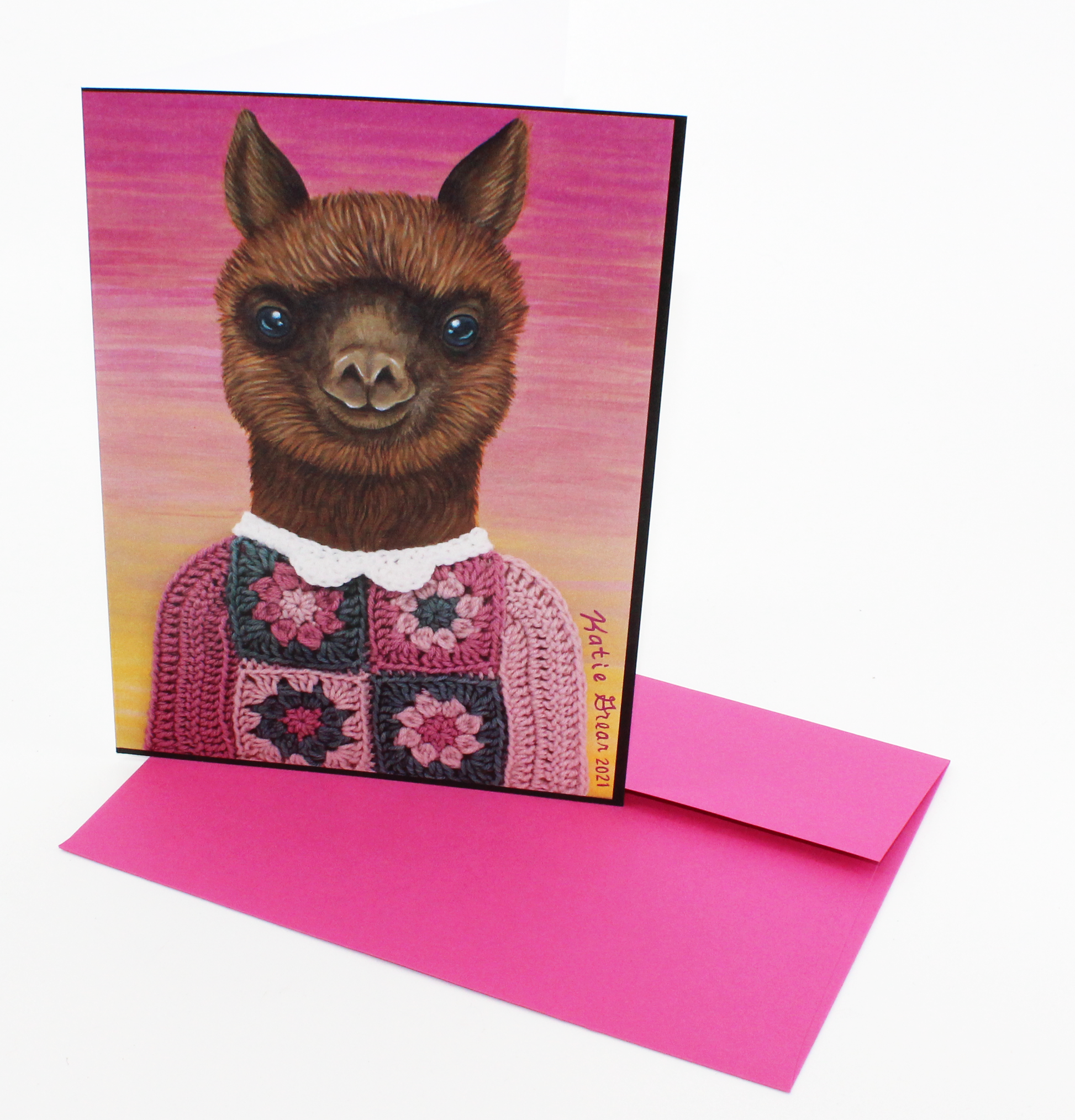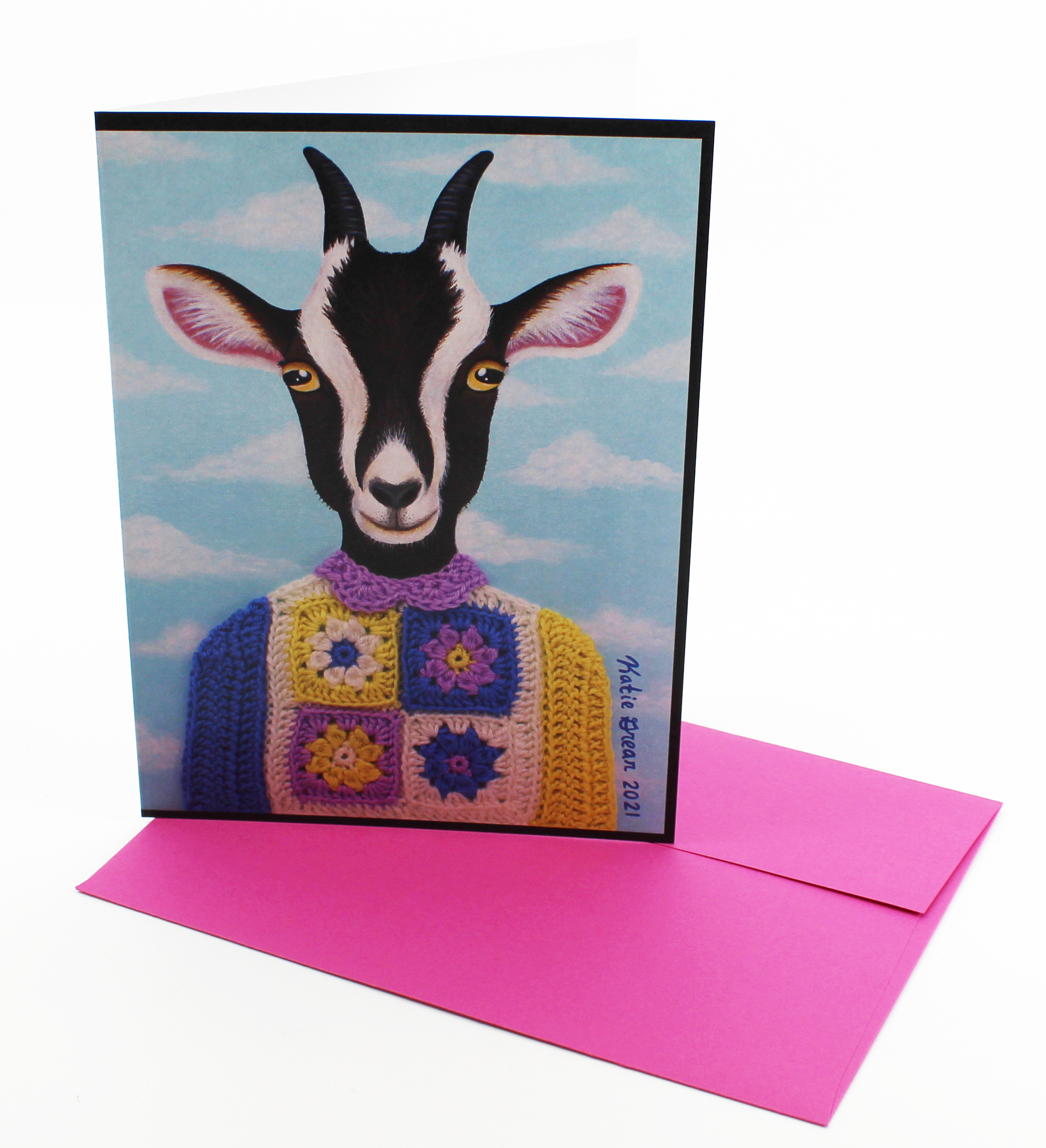 Van Go Grad Katie Grear has put her incredible talent to work with six stunning painted animal portraits. She then knit colorful patterned sweaters for each critter and gave it a name to match its personality. These mixed media masterpieces have been photographed and transformed into this set of charming cards for your enjoyment.