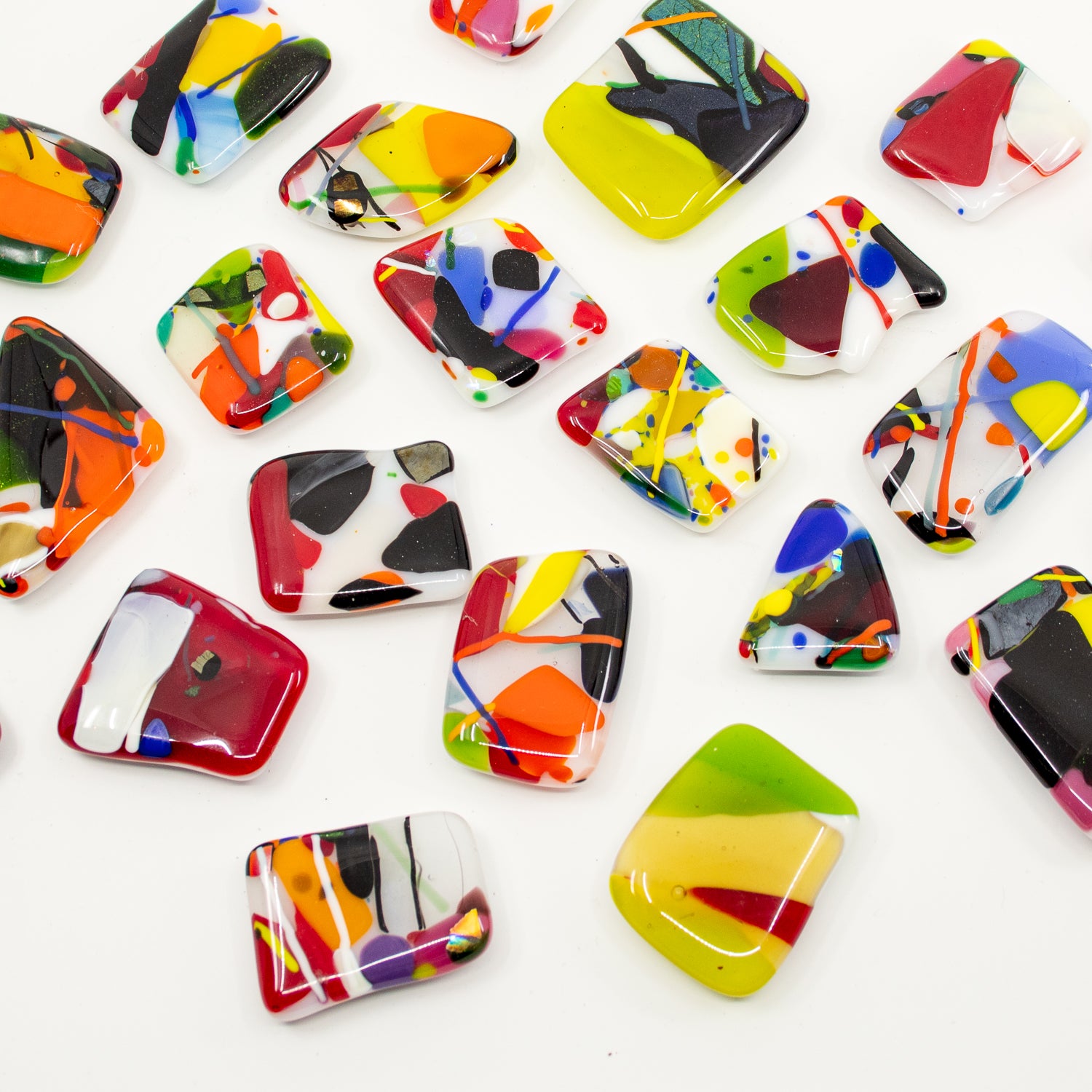 Beautify your fridge with these colorful fused glass magnets! They are ~1.5" x ~2". These pieces of multicolored glass on a white glass base were created with love by the Apprentice Artists here at Van Go. Because this is a handmade item, no two magnets will be the same colors/design.